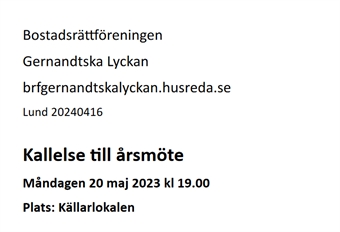| 4 maj 2023 18:41 | | Idag har kallelsen till årsmötet måndagen den 22 maj delats ut i boxarna | | Läs mer |